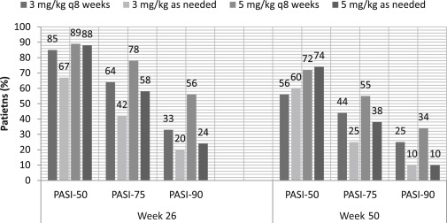 The primary endpoint was the percentage of patients achieving PASI-75 at week 10. Other endpoints were improvement in the PGA and DLQI by week 10, and the average percentage improvement from baseline PASI between weeks 16 and 30 and weeks 16 and 50.