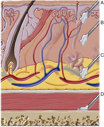 Although confusing, the tenet of intradermal placement is a good starting place for the novice injector. Injecting in the dermis is an appreciated tactile situation with contributions from the pressure of the needle entry and advancement and the syringe pressure. Again, experienced injectors can sense the correct plane. A pearl for novice injectors as to when the needle is in the dermis is observing the needle bevel upon skin entry. When the bevel of the average injection needle enters the skin and cannot be seen, this is an approximate indication that the tip is in the dermal plane. All injectors must be aware of the intended tissue plane target for various fillers ( Fig. 10.1 ). Experienced injectors will frequently layer fillers in different tissue planes to achieve results and sometimes use different fillers for the same injection. These anatomic tissue targets are discussed in detail throughout this chapter.