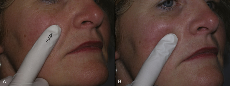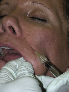 Another means of facilitating NLF filler is to put the cheek on stretch with the non-injection hand. This tension will turn a curvilinear structure into a straight line, making it easier to inject ( Fig. 10.53 ).