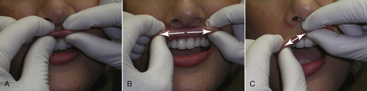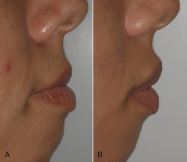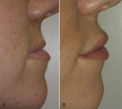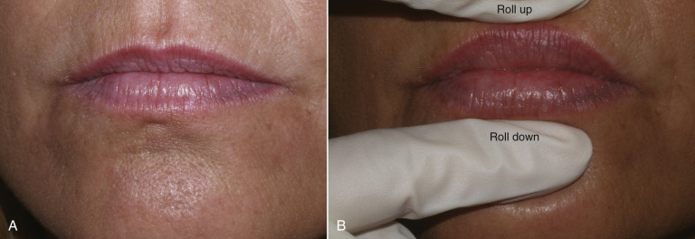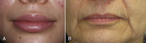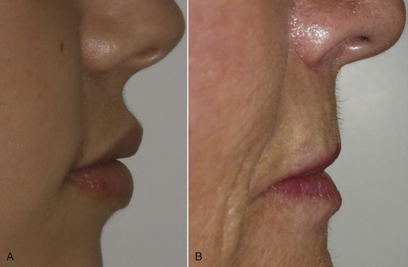 Treating young patients without significant photodamage is usually straightforward. They may simply need a small amount of volume to plump up the lips or some basic vermilion outline for definition. Treating the senescent lip, on the other hand, can be very challenging. The youthful lip is shorter, curvaceous, defined, and volumized ( Fig. 10.7A ). The aging lip lengthens for numerous reasons, including volume loss from skin, muscle, minor salivary gland and fat changes ( Fig. 10.7B ). Loss of tooth structure (attrition) also contributes to postural differences of the lips.