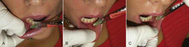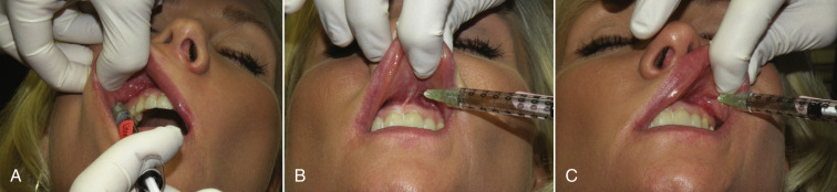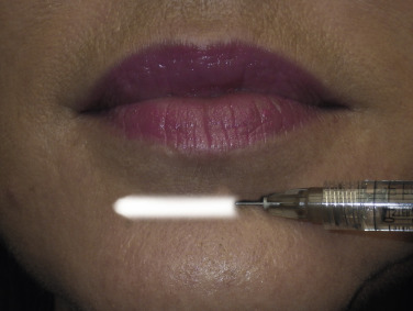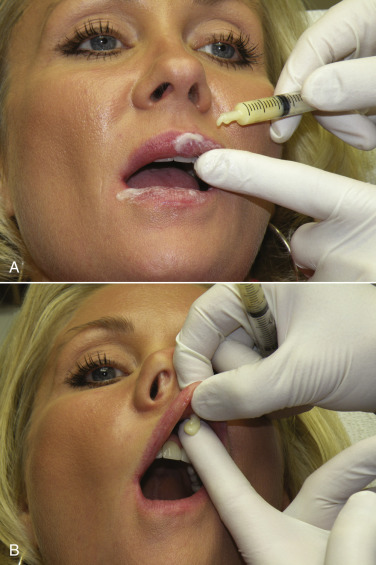 For lip augmentation, topical anesthesia is applied to the external and internal lip and sulcus and on the skin if wrinkles or folds are to be treated. A “BLT” preparation (20% benzocaine, 6% lidocaine, and 4% tetracaine) can be used as can ordinary topical dental preparations. The topical is left in place for at least 5 min. The patient is then allowed to rinse their mouth, as the anesthetic stimulates saliva and will cause numbness in the pharynx, which is disconcerting for some patients ( Fig. 10.4 ).