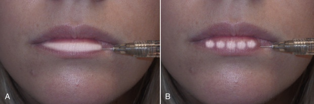 Every practitioner has his or her specific filler injection techniques. The two most popular are linear threading and serial puncture ( Fig. 10.10 ). Linear threading involves inserting the needle and injecting the filler in a straight line while continuously moving in a backward direction. This process would be analogous to placing a line of toothpaste on one’s toothbrush, laying down a seam of calking, or decorating a cake. Although I personally inject while withdrawing, other injectors advocate injecting antegrade to push structures out of the way. I feel that the latter can be more prone to vascular injection. The other injection method is known as the serial puncture technique. This involves placing small boluses of filler with multiple punctures along the lip or wrinkle. In reality, many instances call for a combination of both techniques.