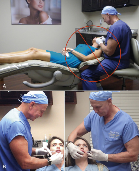 It is important to inject patients in an upright position; gravity will distort a supine patient’s normal anatomy ( Fig. 10.11A ). In addition, many doctors only inject from one side of the chair and this can lead to unrealized asymmetries. It is important to rotate around the patient and inject each side independently for the most accurate results ( Fig. 10.11B ).