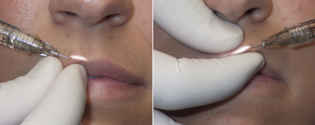 Each patient is evaluated for specific areas of filler enhancement. Some patients (young and old) lack the specific outline of a “Cupid’s bow” or “white roll.” The Cupid’s bow of the upper lip is a lazy-“M” shape, and the corresponding vermilion/cutaneous border (VCB) of the lower lip is curvilinear. In patients with well-defined lip borders, a pleasing light reflex is visible and contributes to maximum aesthetics. If a patient has adequate lip volume, they may only need border outline, but some patients need both volume and outline as well as vertical rhytid injection.