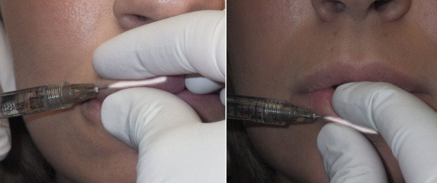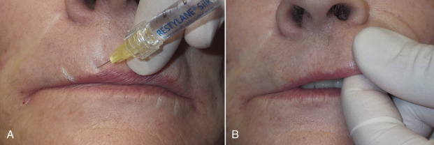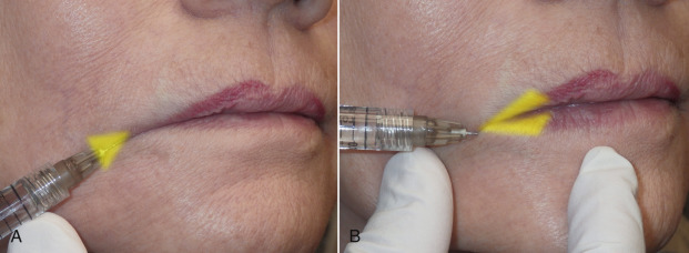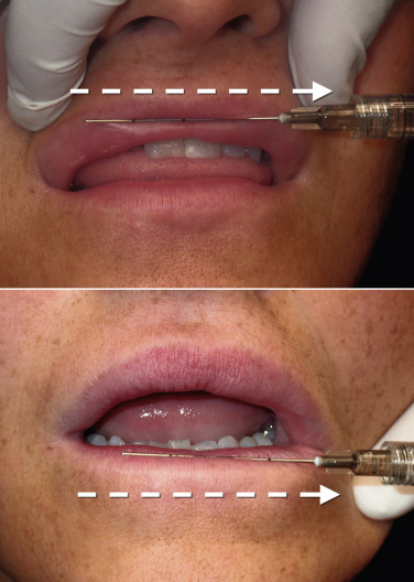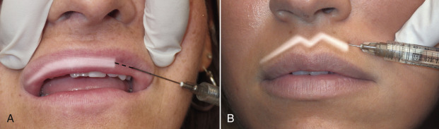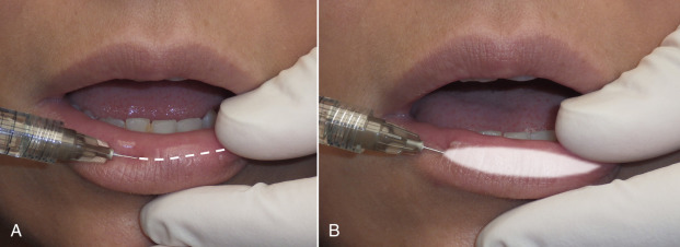When injecting the lip borders for outline, needle placement is critical. A potential space exists between the mucosa and orbicularis oris muscle, and this space is the target of border outline ( Fig. 10.12 ).