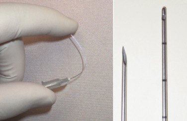 Another convenient means of deep lip volume augmentation is using a specially designed blunt rounded injection cannula instead of the standard half-inch needles that are supplied with filler. Numerous companies produce disposable, flexible 4-cm, blunt cannulas with the orifice set proximal to the tip. These cannulas have a standard Luer Lock connection and are packaged with an “entry” needle of the same gauge ( Fig. 10.19 ). They are blunt and therefore less traumatic, flexible for better negotiation, and can be used in virtually any filler application as conventional needles. Many injectors have switched to using cannulas only. I prefer a 23-gauge cannula for most filler applications.