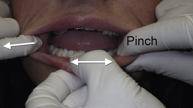 The final step is to massage the filler. Since a puncture hole was made one commissure, it is important to pinch this hole when massaging, so the filler is not expressed out of the hole when massaging toward that side. It is helpful for the assistant to place their little finger in one commissure to stretch the lip, which facilitates the massage ( Fig. 10.23 ). As noted, having a dollop of petroleum jelly on the back of the assistant’s hand is convenient for lubricating the mucosa and skin for massage, without interrupting the process. Some injectors also use the cannula for vermilion outline as well as deep volume injection.