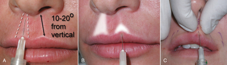 The philtral columns are not vertically straight but rather at a 10–20 degree angle from vertical; the base of the column is lateral to the tip ( Fig. 10.24A ). There are numerous ways to augment the philtral columns. A very simple technique is when treating the lips, conserve the last bit of filler in the syringe and simply place a small peak at the vermilion cutaneous junction at the base of the existing column. This filler is injected in the dermis while the other hand pinches the skin to allow a triangular deposition. This technique does not extend superiorly up to the nostril, but rather becomes a small peaked extension of the angular Cupid’s bow. It only takes a small amount of filler to create this peak and in younger patients it gives the semblance of normal anatomy without treating the entire column. For older patients or those with no defined philtral columns, a more complete reconstruction can be performed. The goal is to replicate the normal angled, conical-shaped philtral column. This is merely a bigger version of the previously described technique but more aggressive; it extends to the nostril just lateral to the columella on both sides. It is important to keep the column tapered and angled 10–20 degrees to appear natural. Pinching the upper portion of the skin helps create the taper ( Fig. 10.24B ).