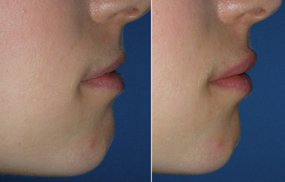 Facial fillers can be used to balance minor facial disharmonies such as mandibular prognathism or maxillary hypoplasia. This is accomplished by enlarging the deficient region. Besides augmenting the vermilion, the skin above the lip is also injected to improve projection (see Fig. 10.22B ). Figs. 10.44 and 10.45 show before and after results of patients with a deficient maxilla and the upper lip posterior to the lower lip before and after correction.