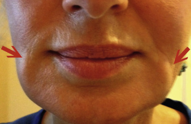Combining neuromodulator (neurotoxin) treatment of the depressor anguli oris muscle with injectable fillers in the area can be symbiotic. When injecting the commissure, it is important to control the flow of the filler, as it has a tendency to spread laterally in this region. If the injector is not cognizant of this, lateral pouches can form, which worsens the deformity ( Fig. 10.34 ).
