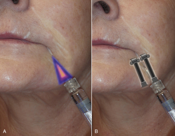 The nasolabial fold and melolabial fold can also be treated with a flexible blunt cannula. Some patients can be treated solely with the cannula ( Fig. 10.37 ). Extremely deep folds may also require intradermal injection with a needle. The cannula can be used to create the base and the needle used to finish the augmentation intradermally.