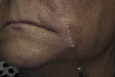Numerous injection techniques are used to treat the oral commissures or the melomental folds and in my opinion, both regions need simultaneous treatment for maximum improvement. Some patients may present with a downturned commissure but without deep melomental folds and just the corner of each lip can be treated. More often, a “hockey stick” configuration is formed by the horizontal commissure and the vertical melomental fold; treating both of these regions simultaneously is the key to improving them separately ( Fig. 10.35 ).