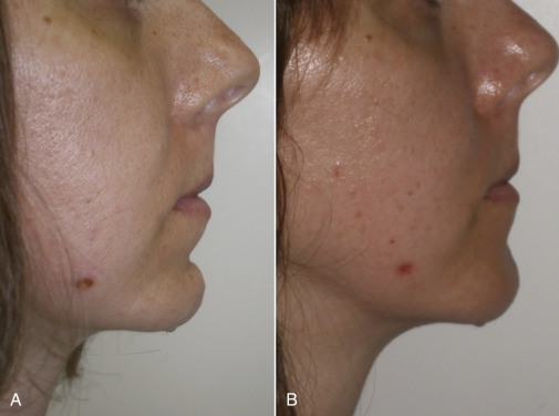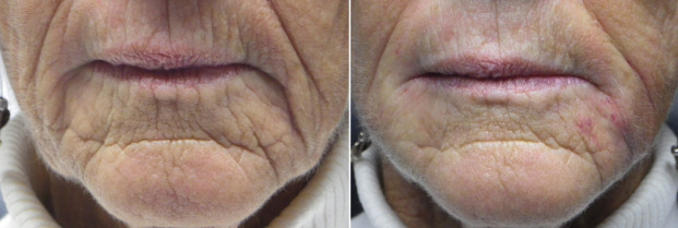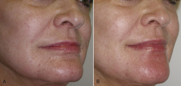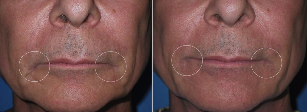 By filling the crevices, there is less moist, deep, and dark yeast-friendly areas. Fig. 10.43 shows a before and after filler injection for perioral rhytids that were associated with angular cheilitis. The condition cleared within 1 week after filling.