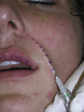When treating the NLF, all makeup is wiped off with alcohol, the folds are marked, and topical anesthesia is applied to the skin. I am an absolute proponent for painless injections and I use local anesthetic infiltrations for all filler injections. The anesthetic technique for the NLF is simple. A 1-mL syringe with a 33-gauge needle (same set up as neurotoxins) is used with 2% lidocaine with 1 : 100,000 epinephrine. We keep a container of these filled syringes in each treatment room, since we use them for many procedures. When using local anesthesia for folds or wrinkles, it is important to inject it deep to prevent distorting the anatomy of the fold or wrinkle, which can affect the accuracy of the result. I generally inject 0.1 mL of local anesthetic at several points along the fold. The first injection is in the area of the nasal ala (a painful region to inject filler), another injection is placed in the mid-fold, and frequently a third injection is placed at the inferior portion of the fold. I make a point to the patient that pain control is very important in our practice and this has paid off many times over in new referrals. The skin does not need to be totally numb, only enough to take the edge off the discomfort.