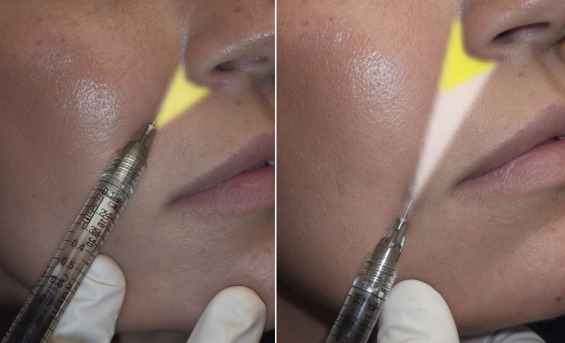Injecting in this target space is both visual and tactile. When the needle is in the correct plane, the filler will visually flow both antegrade and retrograde. This can be seen and also palpated by the non-injecting hand. By pinching the border between the non-injecting thumb and index finger, the injector can feel the free-flowing filler, as well as confine the filler to stay within the border. If the needle is in the correct plane (the described potential space), the filler will flow freely with minor syringe pressure. This is confirmed by observing the border being properly created. If the needle is too deep, no distinct outline is seen. If the needle is too superficial, the filler will not flow but instead “ball up,” and the syringe pressure will increase. In this case, the needle must be redirected into the proper potential space.