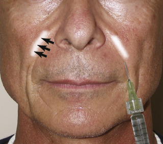 Some patients have paranasal depressions on the lateral nose at the superior portion of the fold and request treatment in this area as well. This is a normal anatomic contour, even in young people, so complete filling is not usually advisable. Older patients, denture patients, or patients with maxillary deficiency may benefit from filling this area. It can be filled as an isolated area but more commonly in conjunction with the entire fold ( Fig. 10.51 ).