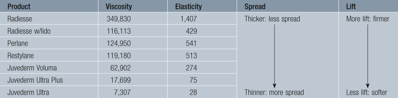 Rheology is the study of the flow of matter and G prime is a common measurement. To determine G prime, the filler is placed between two plates, which are then subjected to a lateral force. The measurement of this resistance to deformation is calculated as G prime. G prime is elastic modulus of the filler or the stiffness. To the clinician this translates as viscosity and the lower G prime fillers are less viscous and placed more superficially, while the larger G prime fillers are more viscous and placed deeper in the tissues. Low G prime fillers are used for fine lines and wrinkles and high G prime fillers are used for lifting and support such as cheek filling ( Table 10.1 ). The degree of cross-linking affects the gel hardness (G prime). Although higher G prime is frequently associated with greater ability to lift, some researchers say that this may be true in vitro but not in vivo.