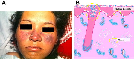 DLE is the most common manifestation of chronic cutaneous LE, and is characterized by single or multiple persistent, well-defined plaques with hyperkeratosis, scaling, telangiectasia, atrophy, scarring, follicular plugging, and peripheral hyperpigmentation with central hypopigmentation ( Fig. 1 A). Fig. 1 B shows illustration of histopathology demonstrating follicular plugging. Female/male ratio is 3:1. Localized involvement of the head and scalp accounts for 70% of DLE, whereas the disseminated form involves the chest, upper back, and extensor surfaces of the arms. High-titer antinuclear antibodies (ANAs) occur in 5% of patients, but generally no anti-double-stranded DNA (anti-dsDNA) antibodies are present. It is associated with photosensitivity in 50% of cases, and a small minority of patients (<5%) eventually develop SLE. Largely because of its chronicity and cosmetic sequelae, DLE severely affects quality of life.