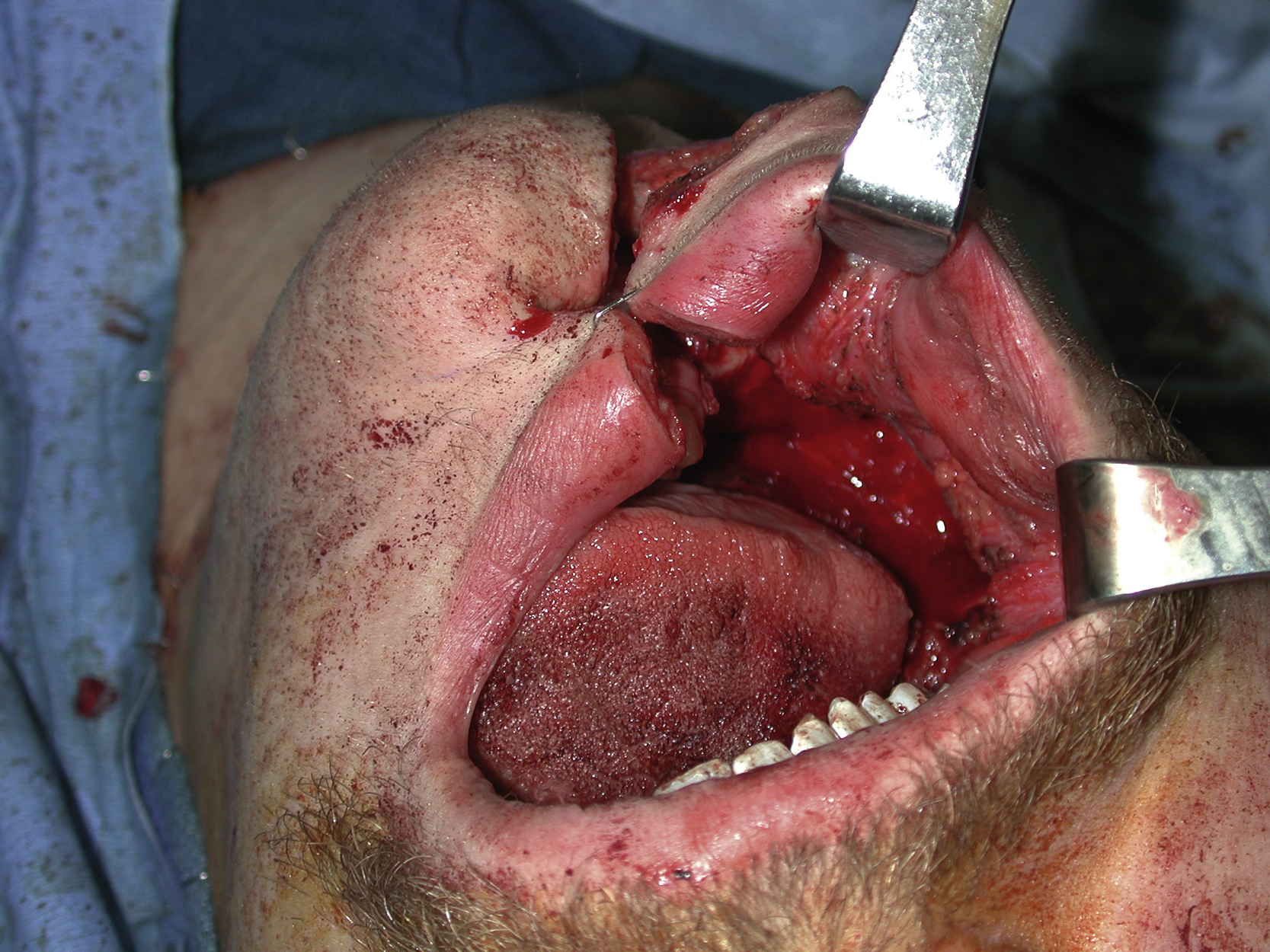 A 19-year-old White male with right alveolar squamous cell carcinoma (SCC) of the mandible underwent local surgical excision of the alveolar edge and the floor of the mouth and a marginal mandibulectomy via a lower lip split approach as well as a right modified neck lymph node dissection by the surgical oncology service ( Fig. 4.1 ). Intraoperative frozen sections of the peripheral and deep margins were confirmed negative for SCC. Following resections, there was a 6.5 × 4.5 cm full-thickness intraoral mucosal defect with exposed alveolar bony bridge ( Fig. 4.2 ).