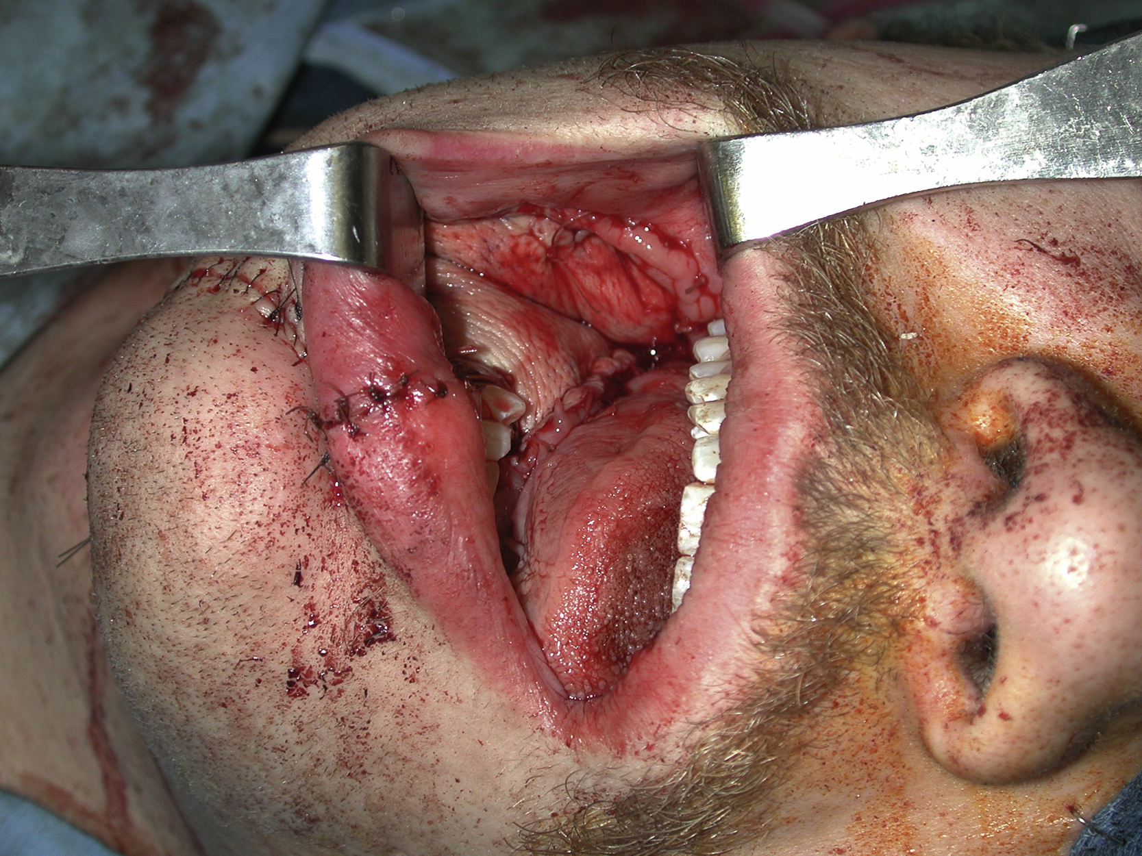 After assessing the intraoral soft tissue defect including the alveolar defect of the mandible, a free radial forearm skin flap was selected for coverage of the floor of the mouth wound and the alveolar defect. The flap is reliable, versatile, and thin and could provide an excellent soft tissue coverage for such an intraoral defect with an easy inset and water-tight closure. In addition, the length of the flap’s pedicle can reach any part of the neck recipient vessels.