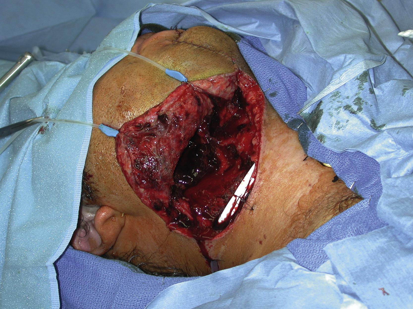 The lower lip and chin incisions were closed in two layers. The neck incision was also closed in two layers after a JP drain placement.