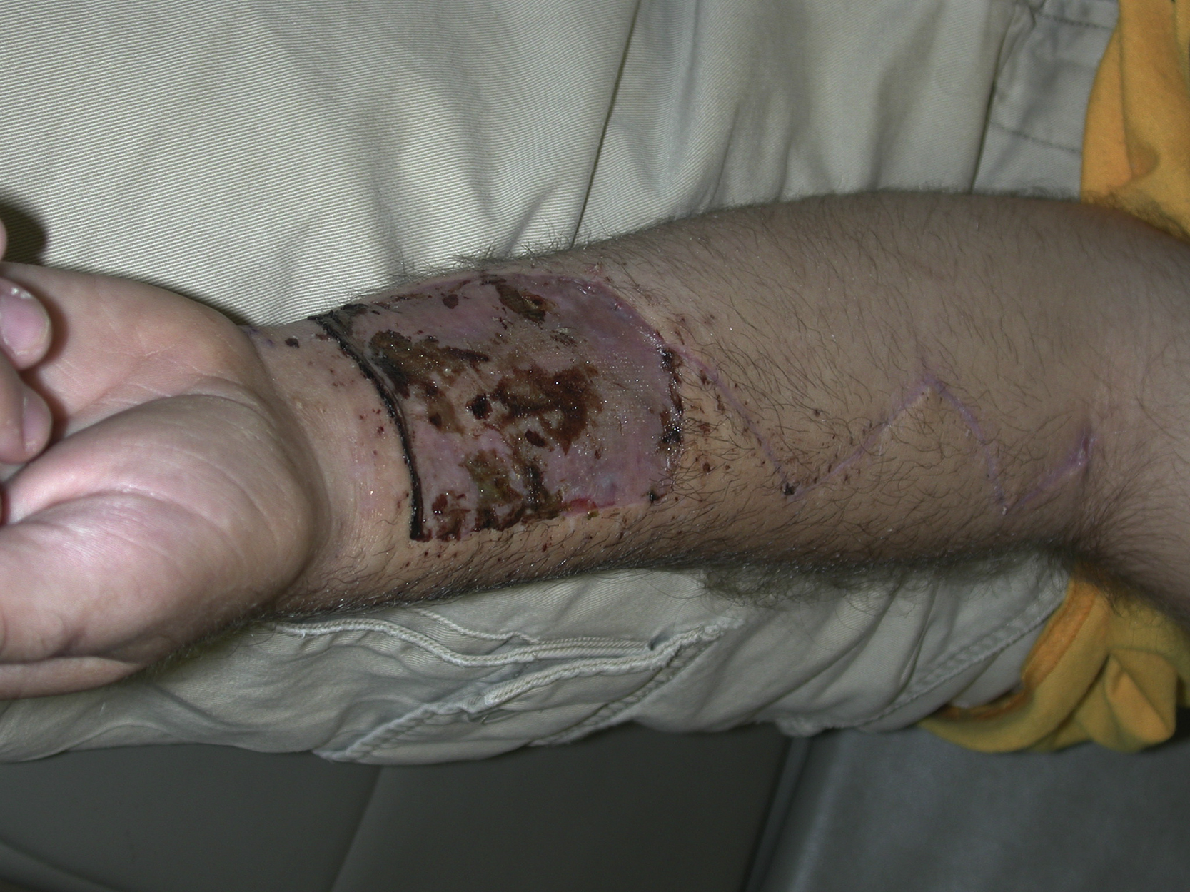 The forearm donor site skin incision was closed in two layers. A split-thickness skin graft was placed to the flap donor site, sutured to the adjacent normal skin edge, and secured with a tie-over dressing.