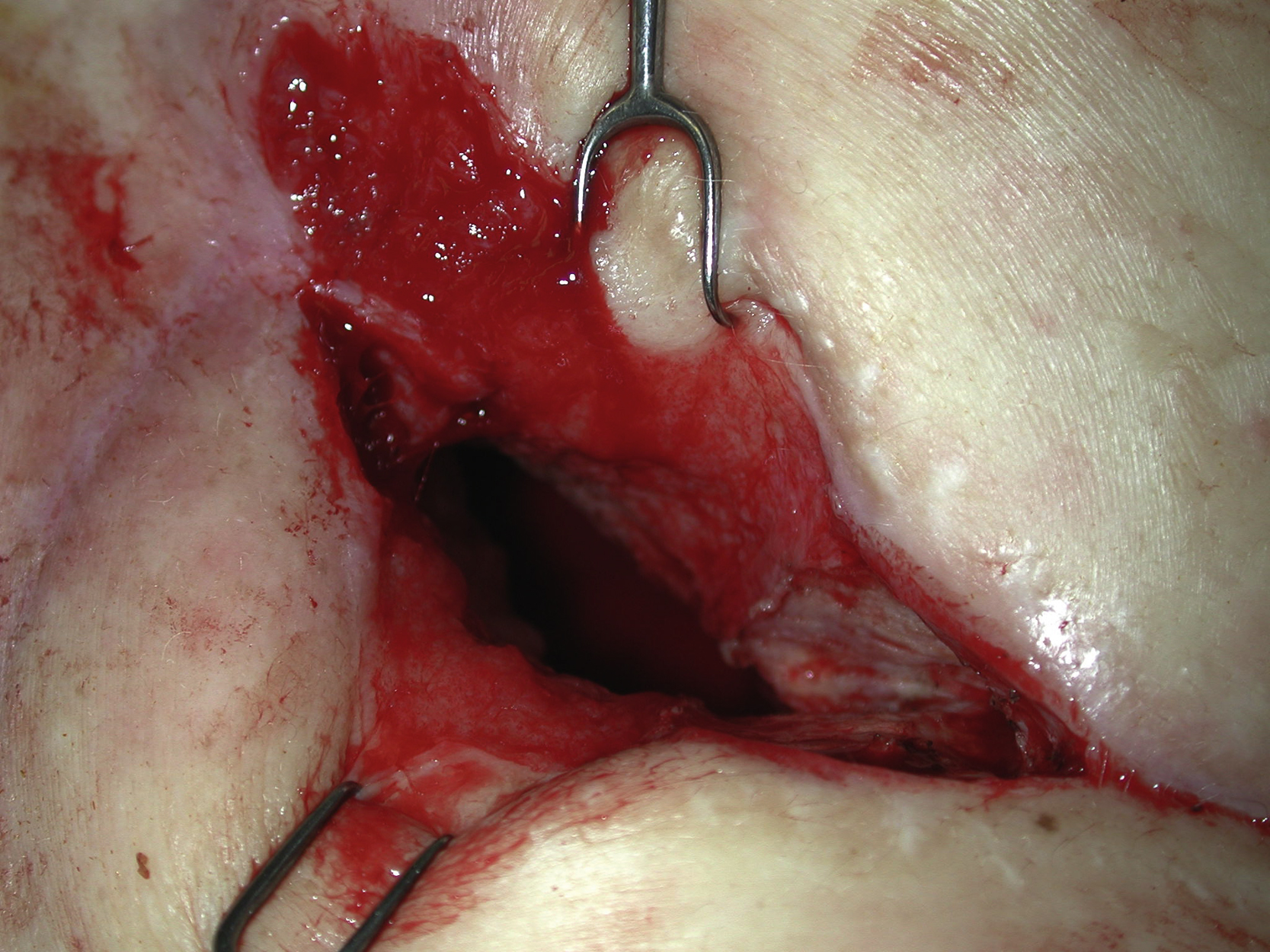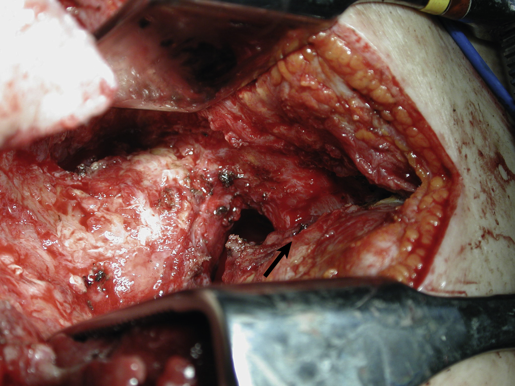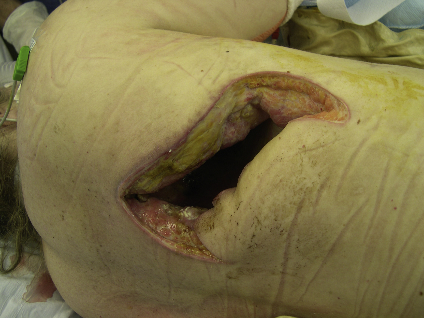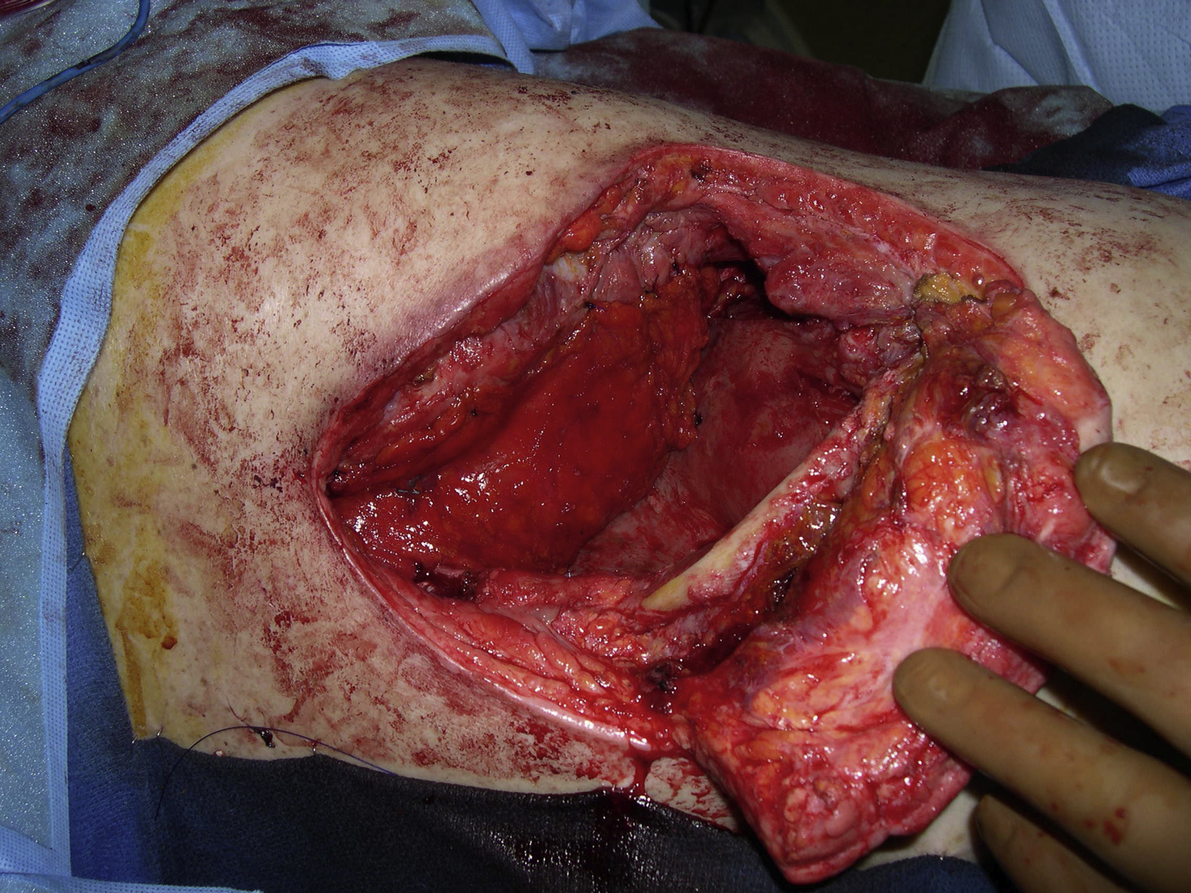 A 49-year-old White female underwent right total pneumonectomy for stage IIIA nonsmall cell lung cancer. She had preoperative radiation and chemotherapy for treatment of her advanced cancer. About 2 weeks postoperatively, she was found to have right bronchopleural fistula with air leak and vancomycin-resistant enterococcus infection as well as methicillin-resistant Staphylococcus aureus infection. A right thoracoplasty was performed initially by the thoracic surgeon to control the bronchopleural fistula. She had a very complicated hospital course including emergent cardiopulmonary bypass to control the bleeding from the right pulmonary artery stump. The plastic surgery service was asked by the thoracic surgery service to help the chest wound closure after repair of the bronchopleural fistula site ( Fig. 24.1 ). The primary service determined that the patient was stable enough to proceed to a more definitive operation to control the bronchopleural fistula and to close the right chest wound.