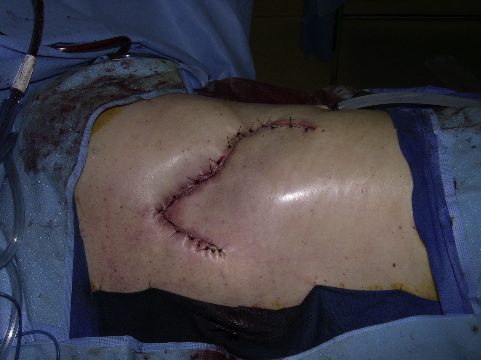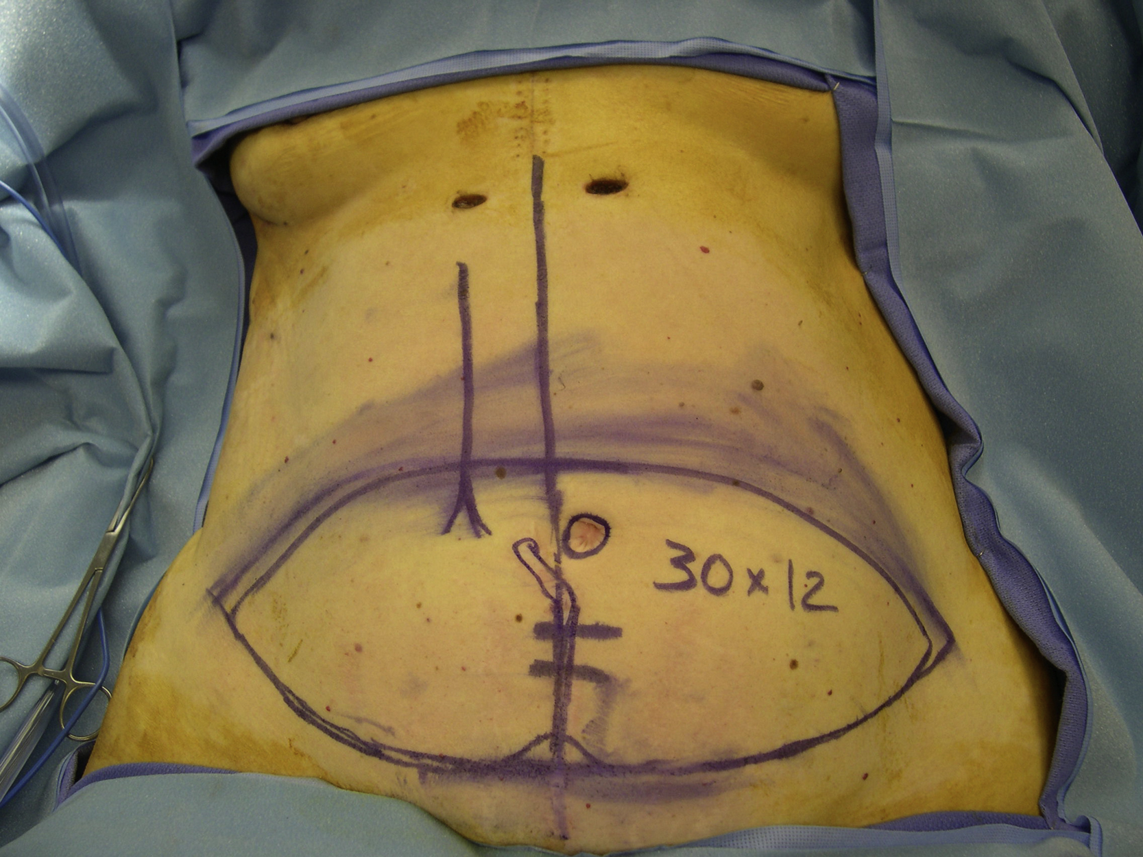 After examining the open wound over the right lateral chest, it appeared that the most part of the open chest cavity was located in the lower chest and the actual fistula site was in the middle chest. A midabdominal transverse rectus abdominis musculocutaneous (TRAM) flap could be selected based on the right superior epigastric vessels. The reason for selecting a midabdominal TRAM flap was because of her previous lower abdominal midline scar and to ensure the near-total survival of the midabdominal TRAM flap based on its large periumbilical perforators. This myocutaneous flap, after de-epithelization of it skin paddle, might provide a large amount of vascularized tissue to seal the bronchopleural fistula site and to obliterate a large part of the pleural cavity. The midabdominal TRAM flap may be more reliable than a standard lower abdominal TRAM flap. It might be possible that all four zones of flap tissue could survive and the flap could be tunneled and placed entirely into the chest.