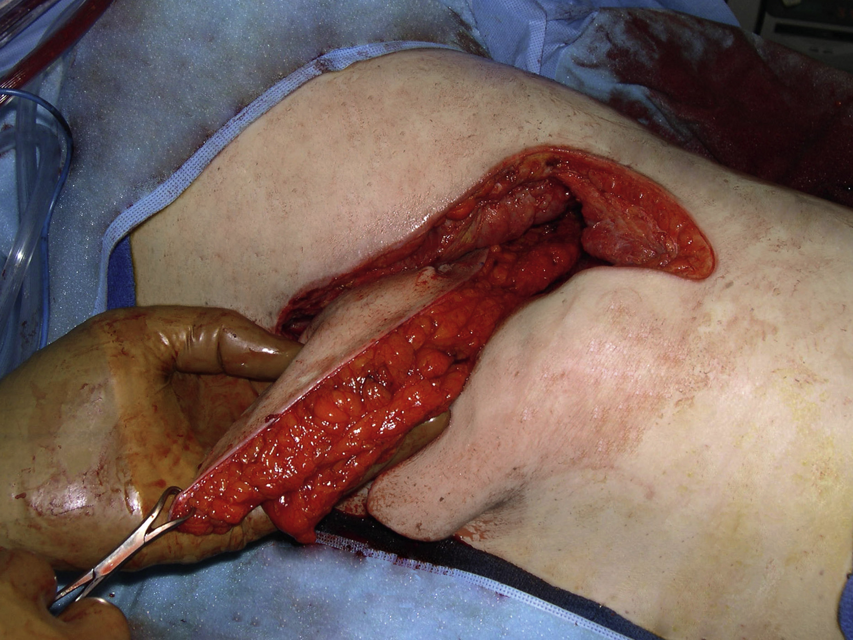 The patient was brought to the operating room by the plastic surgery service about 5 weeks after the right total pneumonectomy. Under general anesthesia with the patient in the left lateral decubitus position, careful debridement was performed to remove all necrotic, infected, or colonized tissues within the right chest. The patient was then placed in the supine position and a midabdominal TRAM flap was designed based on the right superior epigastric vessels ( Fig. 24.2 ). The skin paddle (30 × 12 cm) was elevated first. Once the incisions had been made through the anterior rectus sheath over the muscle, it was dissected free and its inferior insertion was divided. The entire flap was elevated, tunneled through the right subcostal area ( Fig. 24.3 ) and placed inside the right chest without tension after the skin paddle of the flap was de-epithelized. The flap donor site was closed in a standard fashion over two drains.