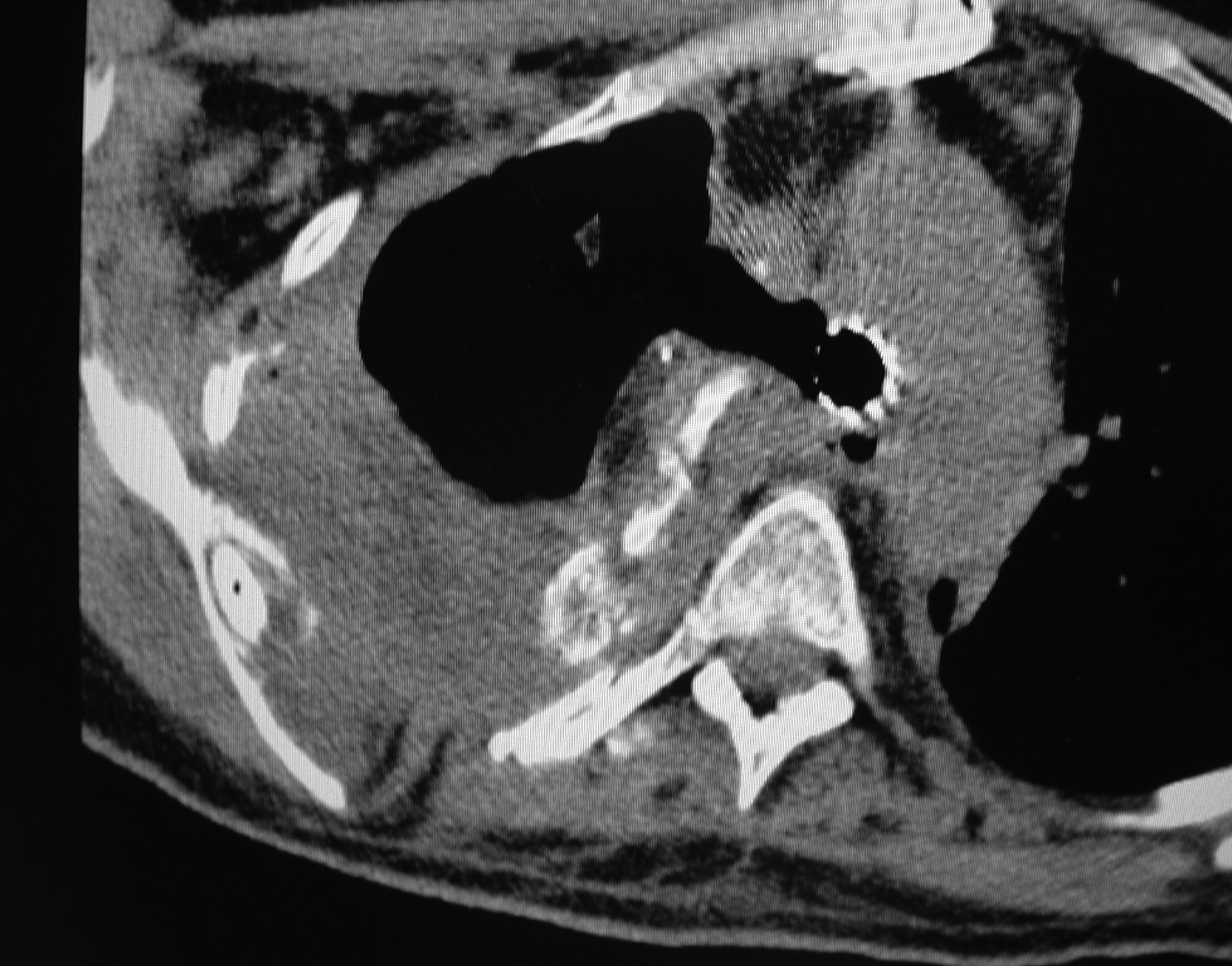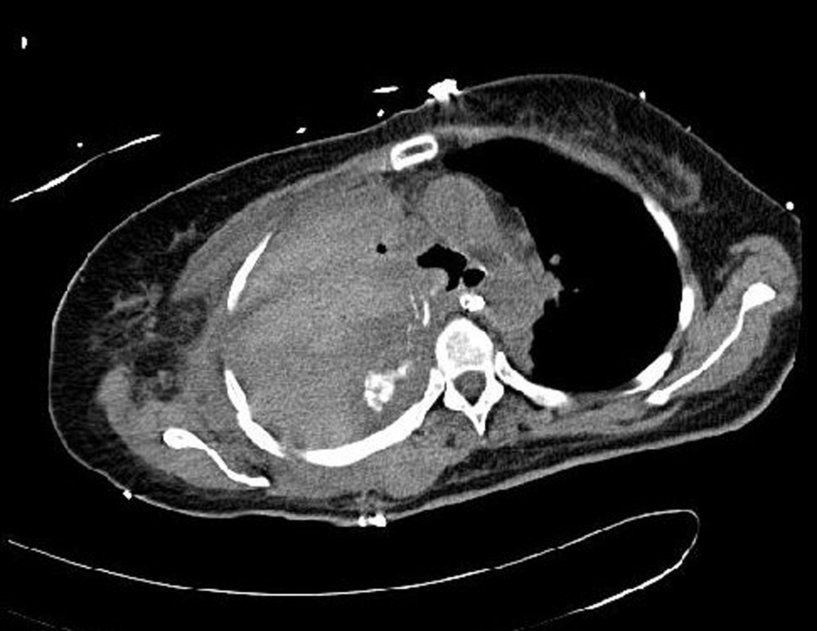 Postoperatively the patient did well except she developed a deep venous thrombosis of the right upper extremity, which was treated accordingly. The air leak and infection appeared to be resolved. Repeated chest CT scans showed a good filling of vascularized soft tissue to the right middle and lower chest ( Fig. 24.6 ). The right chest wound repair site remained closed. She was discharged from the hospital 2 months later.