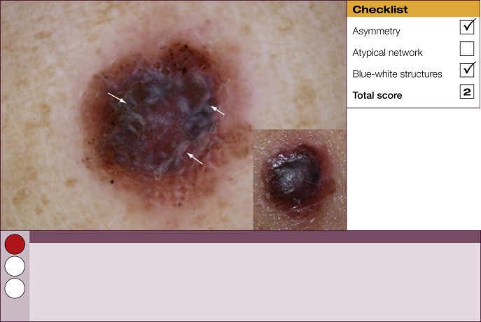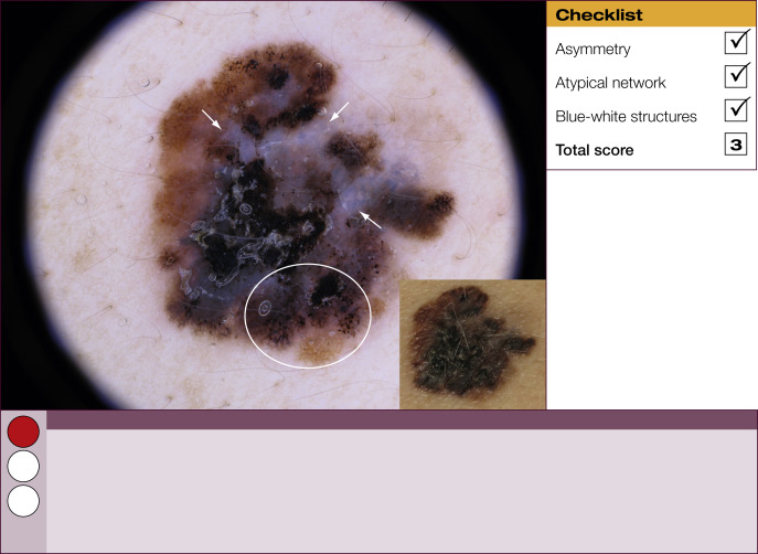 Statistical analysis showed that the presence of any two of these criteria indicates a high likelihood of melanoma. Using the 3-point checklist, one can have a sensitivity and specificity result comparable with other algorithms requiring much more training. In a preliminary study of 231 clinically equivocal pigmented skin lesions, it was shown that, after a short introduction of 1-h duration, six inexperienced dermoscopists were able to classify 96.3% of melanomas correctly using this method.