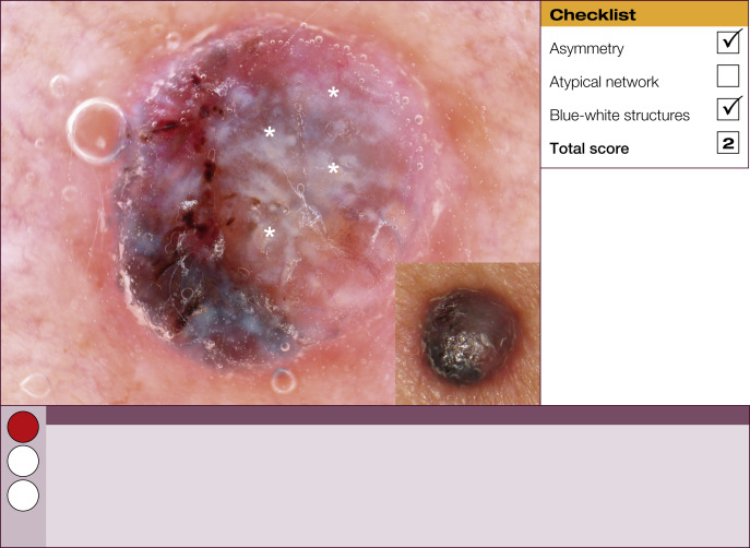 blue-white structures (a combination of the previous categories of blue-white veil and regression structures).