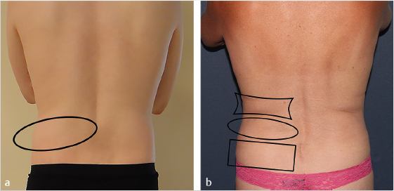 Fig. 8.1 (a) Bilateral male flanks marked by an ellipse. (b) Female hips (rectangle), waist (ellipse), and flanks (polygon). Note the lower waistline in the male patient, with the female waist equivalent to the male flank in anatomic position.
