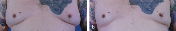 The patient is a 38-year-old Caucasian male with pronounced fat deposits of the chest due to weight gain over the last several years, consistent with pseudogynecomastia (Fig. 8.2a). Laser-assisted tumescent liposuction was performed, using 0.1% lidocaine with 1:1,000,000 epinephrine tumescent solution. Approximately 750 mL of subcutaneous fat was aspirated bilaterally with a 12-gauge cannula. A 600–μm laser fiber emitting 1,440-nm (15 W, 50 Hz) energy was utilized prior to suctioning to help emulsify fat. Marked reduction in chest fat deposits is evident at the 3-month follow-up (Fig. 8.2b; the image has been altered to hide the patient’s upper chest tattoo).