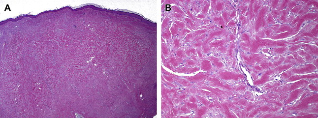 Histologically, keloids invade the normal surrounding dermis, a distinct difference from hypertrophic scars, which stay within the confines of the wound borders. In keloids, collagen fibers are larger, thicker, wavier, and oriented haphazardly. Collagen fibers in hypertrophic scars and normal scars are oriented parallel to the epidermal surface. The collagen fibers in keloids are arranged into thick collagen bundles that are packed tightly together within the dermis, where there is a lack of sebaceous glands and rete ridges. These collagen bundles are also found to lack the presence of myofibroblasts. Hypertrophic scars form fibrous nodules composed of fibroblasts, mostly type III collagen fibers, and vessels. By contrast, keloid scars form nodules with reduced vascularity and a hypocellular appearance ( Fig. 1 ). This acellular core within keloids is characterized by thick bundles of type I and type III collagen fibers interspersed with fibroblasts (see Fig. 1 B).