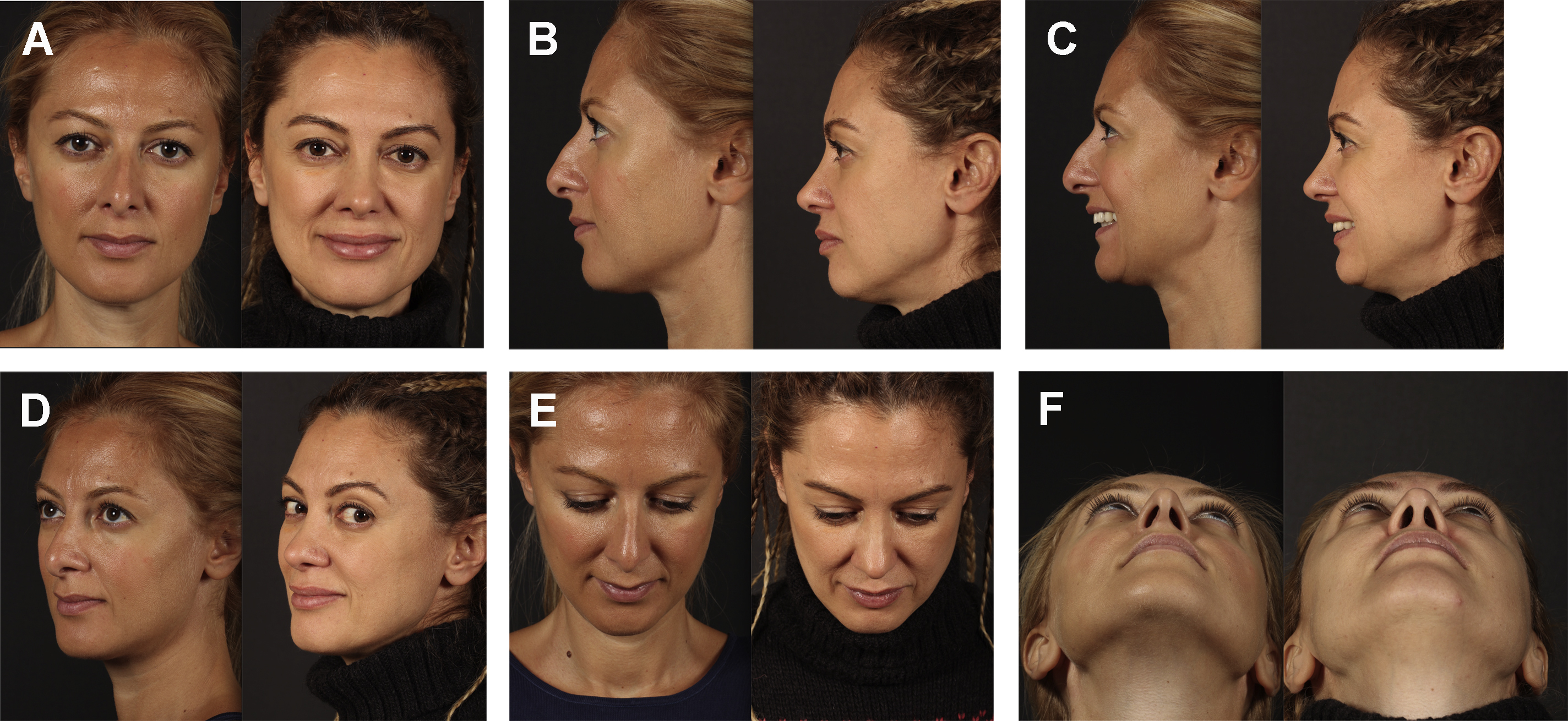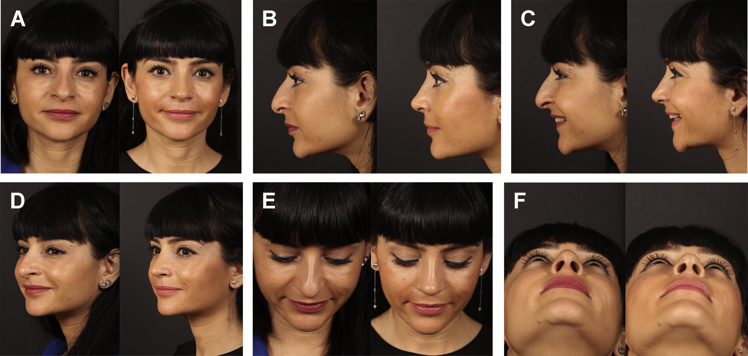 ( A F ) Standard before and after studio photographs of a patient’s 7 years postoperative follow-up after rhinoplasty with SSDT.