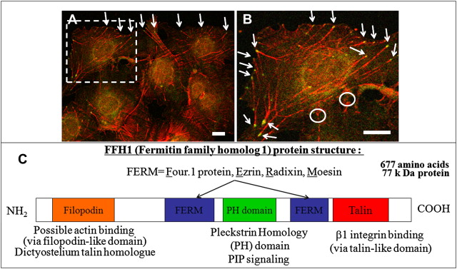 Kindler syndrome (KS) (OMIM173650) is a rare autosomal recessive skin disorder, first described in 1954. The precise mechanism by which FERMT1 gene mutations (encoding fermitin family homolog 1 protein [FFH1]) result in KS symptoms, including blistering, epidermal atrophy, increased risk of cancer, and poor wound healing, remains unclear. Knowledge of some of the more basic FFH1 functions in skin and, in particular, keratinocytes, however, is steadily growing. Cell-matrix interactions are mediated by integrins, heterodimeric transmembrane proteins comprising α and β subunits, and are controlled through integrin activation and cytoskeletal organization. Overall, studies suggest a critical role of FFH1 in cell-matrix interactions via integrin adhesion receptors. An important step in integrin activation is the binding of FERM ( f our point one protein, e zrin, r adixin, and m oesin) domain proteins, such as talin, to the cytoplasmic tail of β integrin subunits. FFH1 (also a FERM or fermitin family homologue protein) can bind to several cytoplasmic motifs within the tail domains of β1 and β3 integrins, colocalizing with vinculin at focal adhesions in cultured keratinocytes. In addition, FFH1 associates with FFH2 (a kindlin-1 homologue, formerly known as kindlin-2) and filamin-binding LIM protein together with other focal adhesions components at sites of cell-matrix contact. Recent cell biologic mutational analysis demonstrated that the second conserved NXXY motif (Tyr795) and the threonine-containing region (Thr788 and Thr789) of the integrin β1A tail, together with the conserved tryptophan in the F3 subdomain of the FFH FERM domain (kindlin-1 Trp612 and kindlin-2 Trp615), are required for direct FFH-integrin interactions. Tissue-specific expression of FFH protein regulates integrin activation, including FFH1 (in epithelia), FFH2 (expressed predominantly in the heart and other tissues), and FFH3 (where expression is restricted to hematopoietic lineages). FFH2/3 proteins are essential regulators of integrin activation, and deficiencies in these focal adhesions proteins leads to cardiac malformation and platelet dysfunction, respectively. These defects make knockout mouse work difficult or prohibitive due to poor survival. From patients with KS disease, it is known that long-term FFH1 deficiency leads to an increased cancer risk; however, the precise mechanisms causing these effects are unknown. Focal adhesions are thought to have important roles in preventing disease by controlling cell survival, growth, signaling, and cell invasion, making them central to the study and treatment of cancer. The role of FFH proteins is thought to be related to stem cell maintenance via its control of important cell cycle processes and also via the regulation of multiple growth factors that are associated with cancer progression and tumor cell survival and, critically, are involved in wounding. FFH1, -2, and -3 form part of a protein family that share a high degree of sequence homology in addition to a bipartite FERM domain interrupted by a pleckstrin homology domain that is important in cell signaling ( Fig. 1 A). Nevertheless, the precise downstream roles of FFH proteins after integrin activation and their involvement in precise signaling pathways controlling specific cell functions remain to be determined.