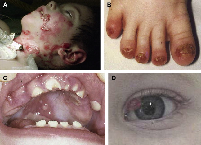 Described mainly in the offspring of consanguineous Muslim families originating in the Punjabi region of Pakistan and India, JEB-LOC is rare and has an autosomal recessive inheritance. Few JEB-LOC cases have been reported in the absence of consanguineous coupling. It is characterized by an altered cry at birth, erosions, nail abnormalities, and aberrant production of granulation tissue, resulting in conjunctival and laryngeal granulomatous papules. Patients are diagnosed in the first few months of infancy and the disease progresses with multiple cutaneous manifestations. JEB-LOC patients acquire facial erosions originating from short-lived blistering, conjunctival papules, and teeth deformities (ie, notched teeth) ( Fig. 1 ). In contrast to the excessive erosions and bulla formation described in other JEB subtypes, patients with JEB-LOC have minimal blistering and extensive granulation formation. The conjunctival lesions start in the lateral portion of the eye and result in symblepharon. The conjunctival granulation tissue often leads to total palpebral occlusion and blindness. Conjunctival granulation tissue is rare outside this variant.