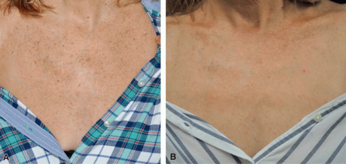 The intense pulsed light (IPL) device is one of the most commonly used and versatile devices in aesthetic medicine. The IPL technology utilizes a xenon flashlamp to emit an intense, broad-spectrum pulse of visible light, usually in the range of the electromagnetic spectrum of 400 to 1200 nm. Cooling of the epidermis with the contact method, aqueous gel, and/or exogenous forced chilled air is important to protect the overlying epidermis during treatment. In contrast to a laser which emits a single wavelength of energy, IPL can be used to treat numerous skin conditions due to the broad range of wavelengths emitted during therapy. However, this nonselectivity is the very reason why IPL is not typically a perfect treatment for any one specific skin disorder. Since IPL can improve a range of skin complaints, including telangiectasias and dyspigmentation, it is often used to treat cutaneous signs of photodamage (Figure 4.1). Studies have reported about 50% to 75% improvement in both the vascular and pigmented components with a relatively low and tolerable side effect profile.4 Cutoff filters can also be utilized to target specific structures and chromophores, such as 550- or 560-nm filter for treatment of telangiectasias. Other common uses of IPL include photoepilation, or hair removal, acne vulgaris, rosacea, and melasma. Practitioners must ensure proper overlap of pulses in order to avoid “striping”, which can manifest in the presence of untreated skin between the treated areas. Striping can be especially seen with single-pass treatment techniques; using multiple passes that