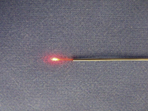 Observe the endpoint to the laser action represented mainly by the overcoming of resistance of the cannula in its movement against the tissue or estimated Joules. A reddish trans-illumination from the aiming beam will assist in locating and directing the laser tip.