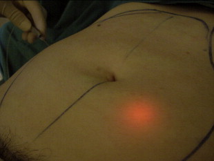 This represents the second step of the procedure. After deep laser energy application, the laser fiber is introduced under the dermis with a steady movement of the aiming beam within the 5 cm × 5 cm square. An assistant frequently measures skin surface temperature using a handheld laser guided thermometer to insure evenness of the heat application as well as the upper limit surface heat (42°C). Caution should be used in thinner skin since it can heat up more quickly. Insufficient energy or advanced age can result in inadequate skin tightening. It typically requires 100–150 J of energy to raise the skin temperature by 1°C. Excessive tumescent fluid can also make it difficult to achieve these goals. More recent methods of temperature measurement are thermal cameras and thermistors incorporated into the laser canula.