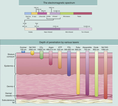 The acronym “LASER” stands for Light Amplification by Stimulated Emission of Radiation. Laser technology in medicine existed decades before it became popular but problems existed with the ability to ablate unwanted tissue without damaging surrounding normal tissue. With the improvement of technology and the understanding of photoscience and tissue response, lasers became a versatile treatment option. The basic principle of laser therapy is known as “selective photothermolysis,” in which the chromophore is targeted with a pulse duration that is shorter than the thermal relaxation time, thus minimizing risks of unwanted surrounding tissue damage. The development of the CO 2 laser (a wavelength of 10,600 nm) was initially used for surgical excisions but eventually was refined as a useful tool for skin rejuvenation and surgical incisions ( Fig. 13.1 ). The CO 2 laser produces tissue ablation and collagen shrinkage and is used to treat scarring, dyschromias, actinic cheilitis, rhytids, and numerous lesions. While the previous technologies of dermabrasion and chemical peel were “an experienced guess” at tissue depth, the CO 2 laser is an instrument that can precisely ablate tissue at predictable depths. The CO 2 laser can ablate 50–150 microns (µm) of tissue with a zone of thermal damage up to 100 µm. The chromophore for CO 2 laser is tissue water and the laser energy is also absorbed by surrounding vessels and structures for unselective tissue destruction. This is different for other lasers that have chromophores of melanin or hemoglobin and are much more specific as to the tissue target. The earlier CO 2 lasers were continuous wave in nature and more difficult to control lateral tissue damage. With the advent of ultrapulsed lasers and computerized pattern generators, high-peak powers and short-pulse duration were possible in which tissue vaporization was maximized and thermal injury minimized. Laser treatment rejuvenates the skin by several actions. First, it vaporizes the epidermis and superficial dermis. This in and of itself is like stripping old wallpaper or pulling up old carpet. When the new skin reepithelializes, the patient has youthful skin in the place of the damaged skin. Also, the thermal effect on the dermis creates neocollagenesis. The new and more plentiful collagen also firms and rejuvenates the skin.