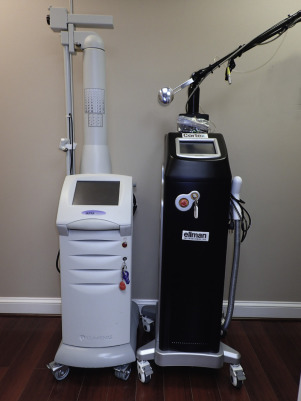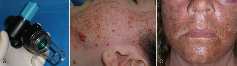I also have experience with the Ellman Cortex CO 2 laser ( Fig. 13.2B ). This is a very affordable and versatile system. The CO 2 component is exclusively fractional but can be used more aggressively by performing multiple passes on the skin. Technically, when additional passes are performed with a fractional laser, the treatment is technically not necessarily fractional as the intact bridges of skin between the treated columns are also lasered, making it full (or fuller) coverage. I have used this laser with the fractional mode and with multiple overlapping passes with good results. This laser also has an incisional handpiece for blepharoplasty surgery or lesion ablation. An appreciable bonus of the Ellman Cortex laser is the Erbium handpiece. This comes with the laser and is a great option for very superficial resurfacing and treatment of superficial skin lesions such as dyschromias. The Erbium handpiece on this laser is single spot only (with several screw-on treatment heads to adjust size) but has a 5-mm spot size, which makes coverage efficient.