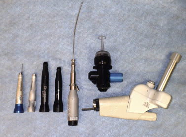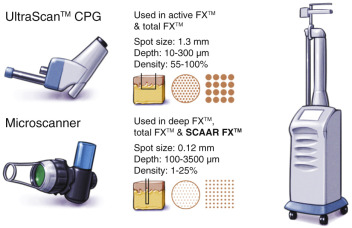 Although I have used all of the popular types of resurfacing lasers, the majority of my treatments have been with the Lumenis Ultrapulse Encore laser (Lumenis Inc., Santa Clara, CA), in the performance of a wide array of treatment depths from superficial fractional to ultra-deep ( Fig. 13.2 ). The Lumenis Encore CO 2 laser has a peak output of 60 watts and at 600 Hz with 100 mJ setting will produce a fluence of 7.5 J/cm 2 . The laser is equipped with a computerized pattern generator for skin resurfacing as well as straight handpieces for lesion removal and tissue incision ( Fig. 13.3 ). Currently, several options are available with the Encore laser, including a curved laser wave guide that can be used for endoscopic brow and forehead lift and a computerized scanner for deeper fractional treatments (Deep FX and SCAAR FX) for newer technology deep fractional scar treatments.