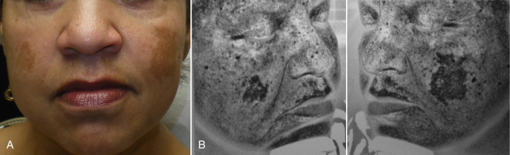 In treating various skin types, surgeons should keep in mind that the darker a patient’s skin is, the more potential problems can exist with peel or laser, especially hyper- or hypopigmentation ( Fig. 13.6 ). The very light skin types and the darkest skin types are the most stable for resurfacing; the mixed browns are the most problematic in terms of pigmentation difficulties. Referred to as global skin , this type should always be approached with caution when using peels and lasers. The best patients for the novice resurfacing surgeon are Fitzpatrick I and II skin types. Type III and above should be reserved for more experienced surgeons. Most doctors do not routinely laser dark skin and default to chemical peel for these patients. Fractional laser resurfacing is used with caution on select cases ( Fig. 13.7 ). Laser surgeons must keep in mind that they can make a patient permanently lighter or darker. Anticipating a patient’s skin response to resurfacing is in part based on their skin type and amount of melanin, as well as the depth of the melanin. Computerized skin scanning systems are very useful for diagnosis and patient education ( Fig. 13.8 ). Similar to placing a patient under ultraviolet light, the filters on the scanning systems enhance epidermal melanin ( Fig. 13.9 ). This means that superficial pigment will show up dark and deep pigment will not be as dark. When pigmentation is extremely dark and noticeably obvious, it is superficial and will most likely respond well to medium-depth dermal peels and lasers. If the pigment does not enhance and darken on the scan, it is likely deeper dermal pigment and may not improve with peels and lasers.