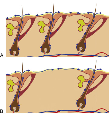 After the epithelium is destroyed by chemical agents or light sources, it must regenerate, or a full-thickness burn scar will result. Reepithelialization occurs from the base of the pilosebaceous units, and the presence of the hair/sebaceous gland unit is directly related to how much and how quickly the new epithelium regenerates. In a process known as epiboly , the pilosebaceous units serve as the progenitors of new epithelium. New epidermal cells migrate from the base of the pilosebaceous unit, progress up the hair shaft, then spread laterally on the injured skin surface ( Fig. 13.10 ). Areas of the body that are heavily populated with pilosebaceous units have a better chance of more rapid epithelialization. The face has 30 times the pilosebaceous units as the neck or chest and 40 times the number on the dorsal arms and hands. For this reason, deeper peeling and laser treatment can be performed on the face, whereas the same treatment on the neck or extremities can lead to disastrous scarring. Areas heavily populated with hair follicles heal faster; with low hair-bearing areas, the epithelial cells simply have too far to travel and scarring can result.