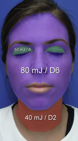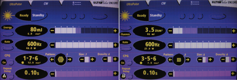 In all cases, the Lumenis Encore Ultrapulse laser was used in a fully ablative manner with a computer pattern generator set at 80 mJ (6 J/cm 2 ) with a density of 6, and 600 Hz. In most cases, the central oval of the face was treated with 2–3 passes of laser and the perioral region was treated with 3–5 passes at the same settings. The skin surfaces were NOT debrided between passes.