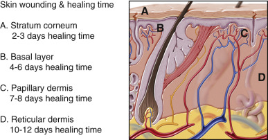 The laser operator should have a firm understanding of the amount of skin damage of the each patient and the depth of wounding of the proposed treatment. Beginners should only begin with mild to moderate treatments and progress with experience. Although it is difficult to truly measure the penetration of the laser burn and related thermal damage, it can be generalized by understanding the tissue layers of the skin and relative depth of penetration of the specific laser. Most lasers can predictably remove 50–100 µm of skin in a single pass. The second pass may remove a similar amount of skin or have a little less penetration due to desiccation of the skin after the first laser pass. Also important and directly related to the depth of treatment is the time required for reepithelialization after laser treatment. A basal layer treatment will heal in 4–6 days, while a reticular dermal treatment will take up to 2 weeks to heal. Wounds that take longer than 2 weeks to reepithelialize may heal with full-thickness scarring. Fig. 13.12 shows tissue anatomy of the skin, as well as the time required for reepithelialization after laser treatment.