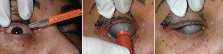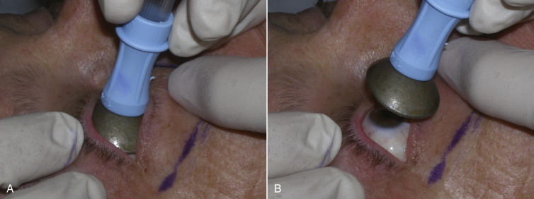 Placement of corneal shields is an absolute requisite when using lasers on the face, as serious eye damage has occurred by inadvertent laser contact ( Fig. 13.13 ). The placement of corneal shields is very simple. Several drops of commonly used local anesthesia (with or without epinephrine) are instilled in each eye and the stainless steel polished corneal shields are placed in the fornix of the lids, with suction cup holders ( Fig. 13.14 ). Dedicated topical ophthalmic anesthetic drops can be used as well. Although some surgeons lubricate the shields with an ophthalmic ointment, I have abandoned this, as it seemed to produce more irritation. At the end of the procedures, the shields are removed and the eyes are irrigated with saline solution. Some patients have larger or smaller palpebral apertures and this may require multiple size shields. In the event that swelling makes the removal of a shield difficult, a wall suction hose tip can better grip the shield for removal ( Fig. 13.15 ).