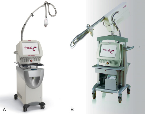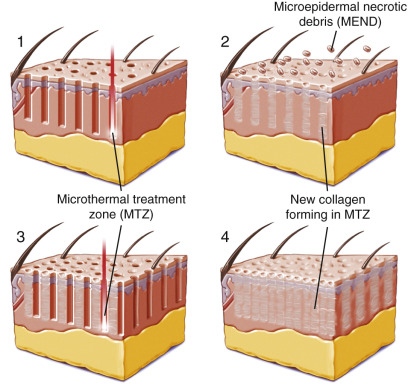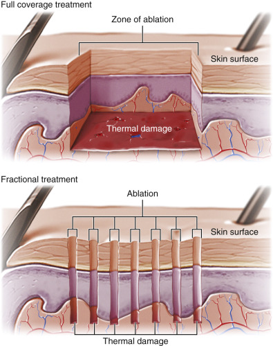 ). This nonablative platform utilizes a 1550 nm Erbium-doped fiber laser combined with a 1927-nm wavelength that produces micro-column ablation. Solta Medical also produces a platform called Fraxel Repair, which is an ablative CO 2 laser. These localized columns of thermally denatured collagen stimulate collagen remodeling while leaving islands of intact dermal and epidermal cells, which in turn leads to speedy epithelial recovery, thereby minimizing downtime ( Fig. 13.22 ).